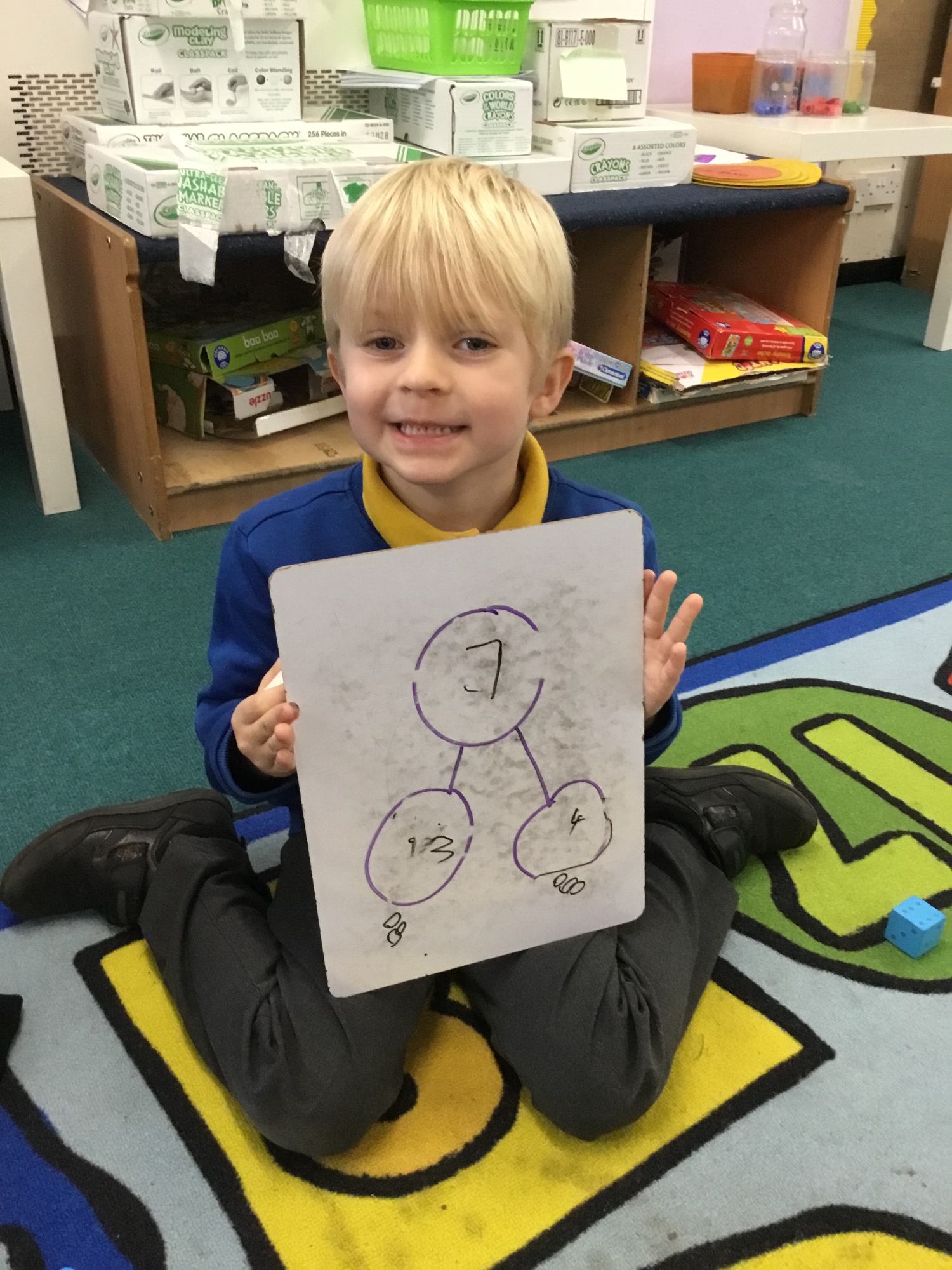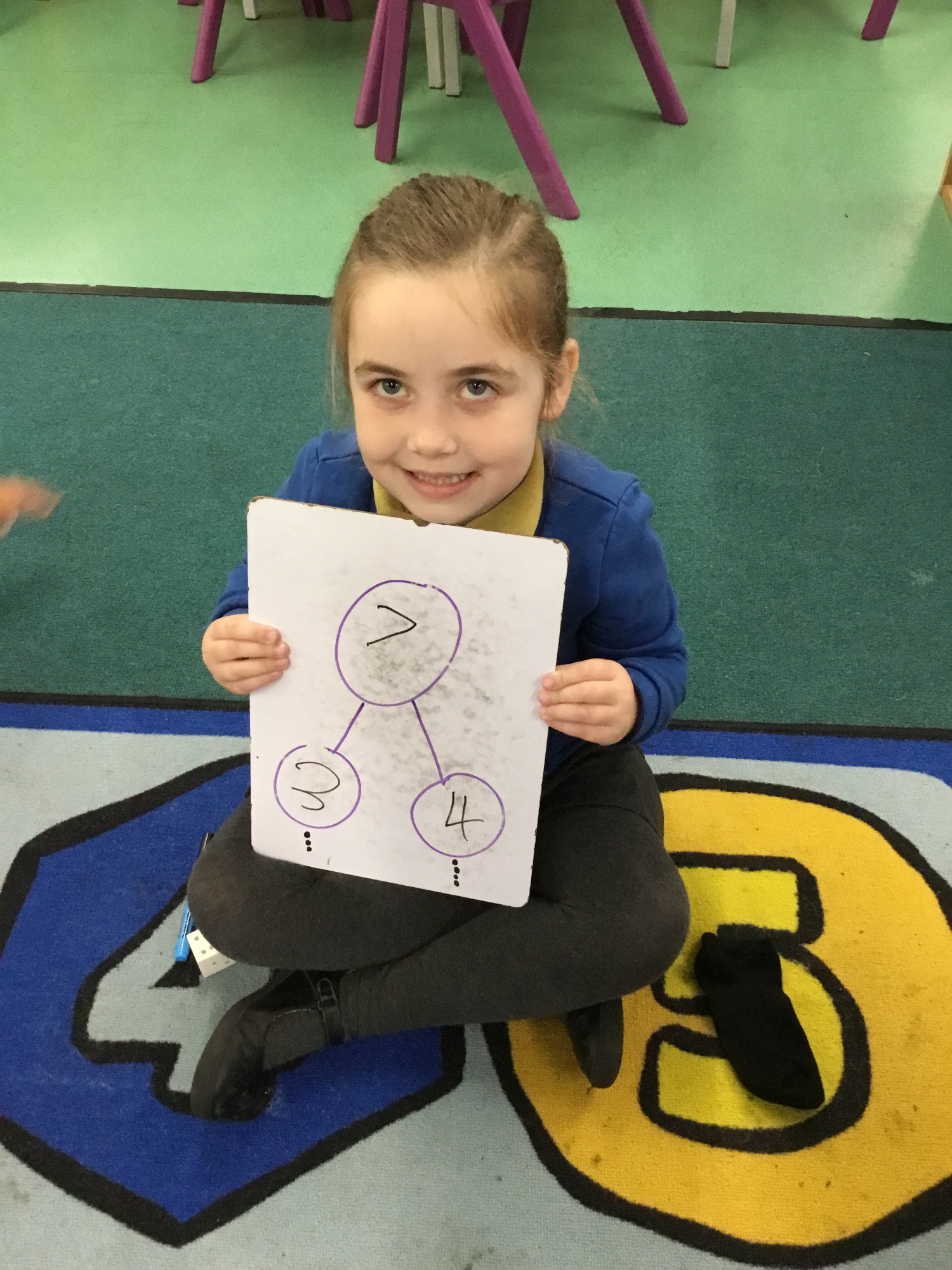Pupils add and subtract using concrete objects, pictorial representations, and mental strategies, developing understanding of number bonds and fact families.